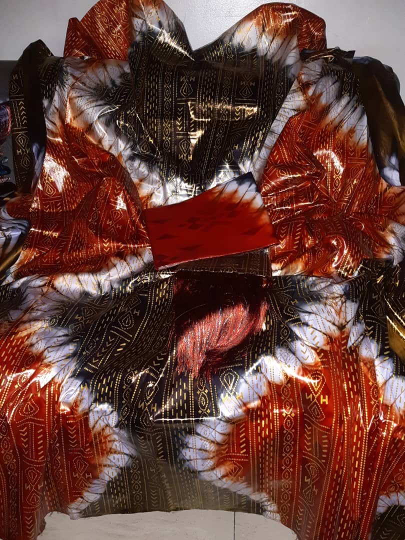 6 mètres = grand boubou bien long (3m30) + 0,70 écharpe + 2m pagne (le foulard se coupe en haut du pagne au moment de la couture). Livré sans couture. Si vous désirez la couture en grand boubou simple, elle est gratuite, il suffit de le préciser en commentaire au moment de la commande.