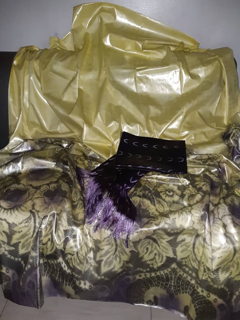 Le pagne et écharpe de ce boubou miel est un siri haut standing, fruit d'un travail artisanale minutieux. Une création inimitable by Dimanche à Bamako.